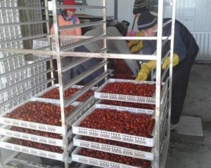 5、装枣:每平方米烘盘装枣量,因不同品种而异。一般为7.5公斤左右,装枣厚度以2层为宜。小果品种如金丝小枣可适当增大装枣量。