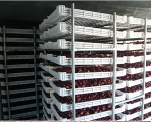 8、回软暂存:对刚烘出的干枣,要立即进行通风散热,时间约需2~3天,以防止果肉松软,积温发酵变酸。之后还要再经过15~20天的堆放处理,使果肉内外水分均衡,质地柔软,保证烘干枣的品质。最后对烘干枣成品进行科学的分级、包装和贮藏。